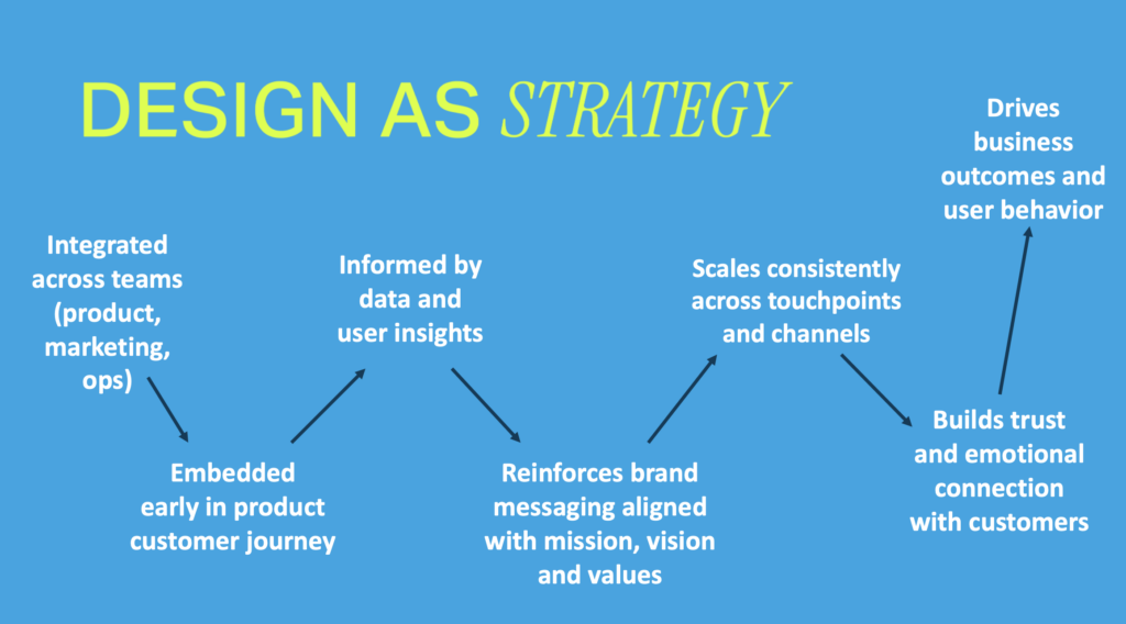 Strategic design flips that script. It’s informed by data and consumer insight, not personal taste. It reinforces mission, vision, and values across every interaction. It becomes a shared language teams can rally around — accelerating decision-making instead of slowing it down.